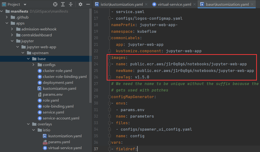 以 “Jupyter Web App”为例,我们可以在kustomization.yaml中看到完成该组件所需使用镜像。