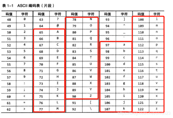 - 以英语为例,使用最广泛的是ASCII编码表,其中一部分如下图所示: