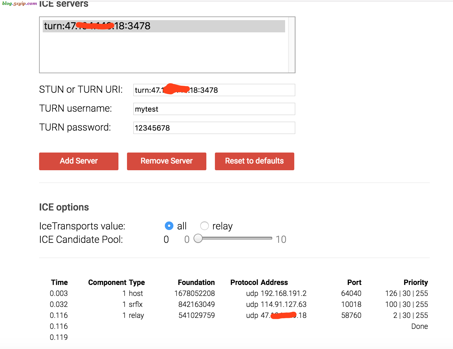 - turnURL=mytest:12345678@47.xxx.xx.18:3478?transport=udp