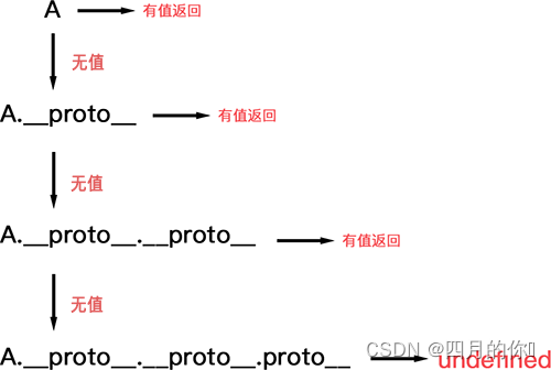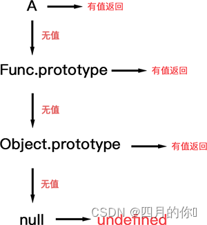 当我们用构造函数 Func 实例化一个 对象 A 后,访问 A 的属性时,先在 A 自身寻找,没有的话会通过A. __proto__ 去他的原型对象 Func.prototype 上找,如果还是没有会去 Func.prototype.__proto__ 往 Object.prototype 上找 如果还没有在通过 Object.prototype.__proto__ 找,如果有就返回没有的话因为此时 Object.prototype.__proto__到顶 是 null,没有对应的方法属性 返回 undefined