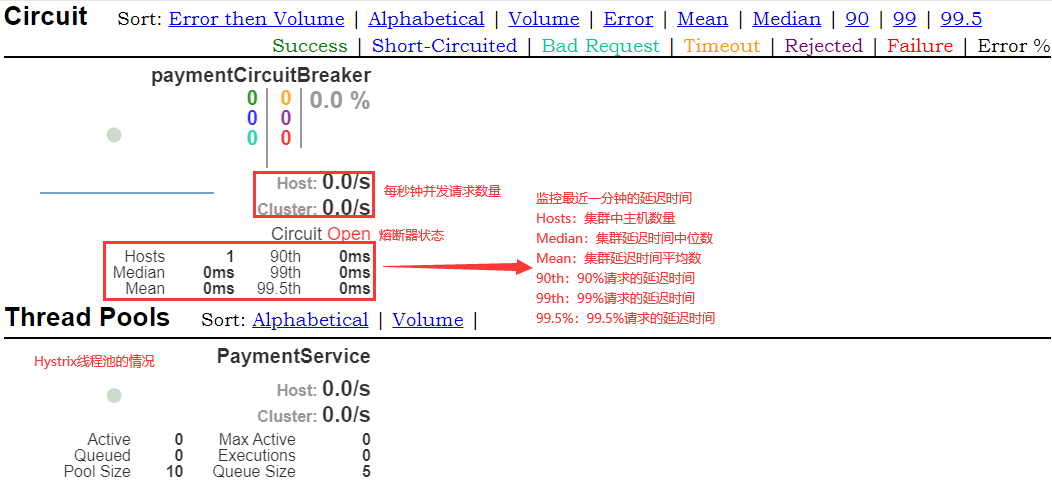 在监控页面的右上角,有7种颜色,从左到右分别对应:请求成功数量、请求熔断数量、错误请求数量,超时请求数量,线程池拒绝请求数量,请求失败数量,最近10秒的错误率。