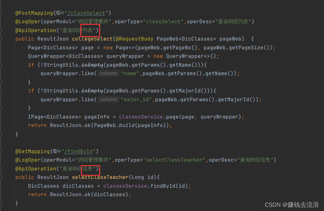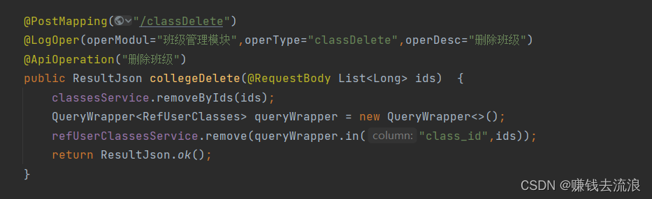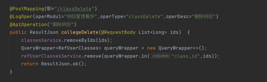 不仅要删除dic_classes表中的,也要删除关联表中的,不需要自己写什么方法,用mybatis plus 自带的方法加上条件构造器就够了,因为关联表中是没有主键的,所以要用到条件构造器