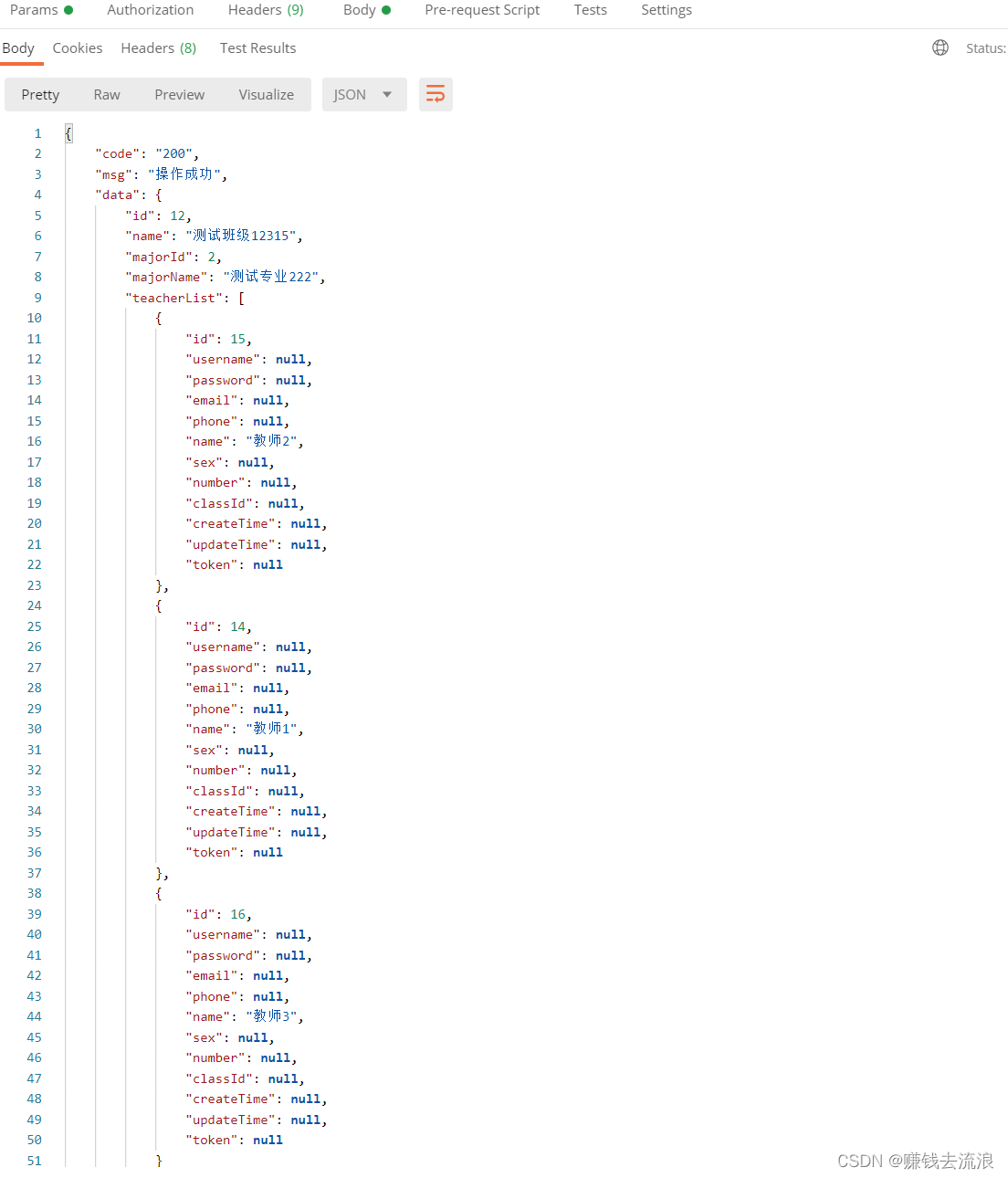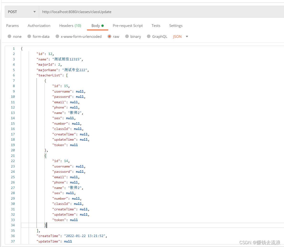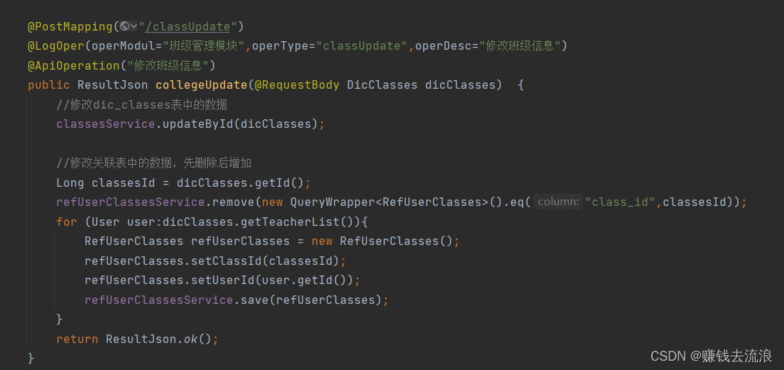 tip:先删除再增加就是,比如classId = 12时,teacherList里面原来有id为14,15,16的,现在我要修改成只有14,15的,那么先把关联表中classId = 12 的全都删掉,再把userId(教师id)为14,15的加进去,并且新加进去的14, 15的classId仍为12