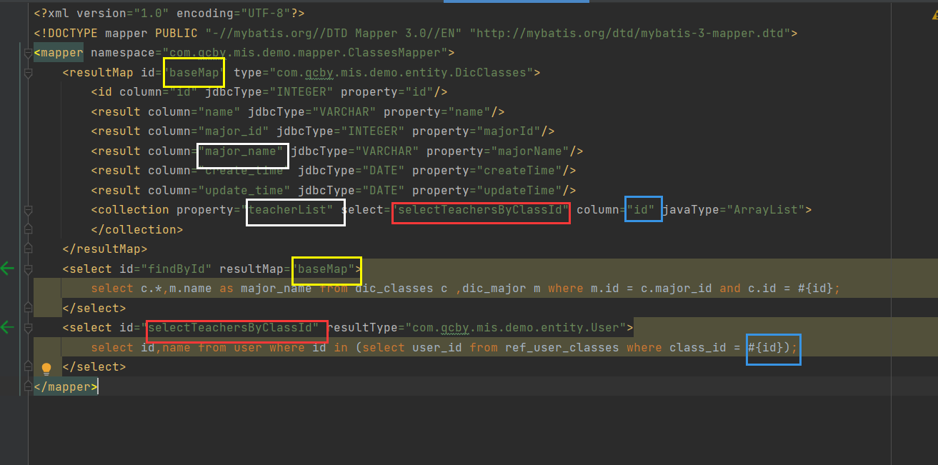 <select id="selectTeachersByClassId" resultType="com.qcby.mis.demo.entity.User">