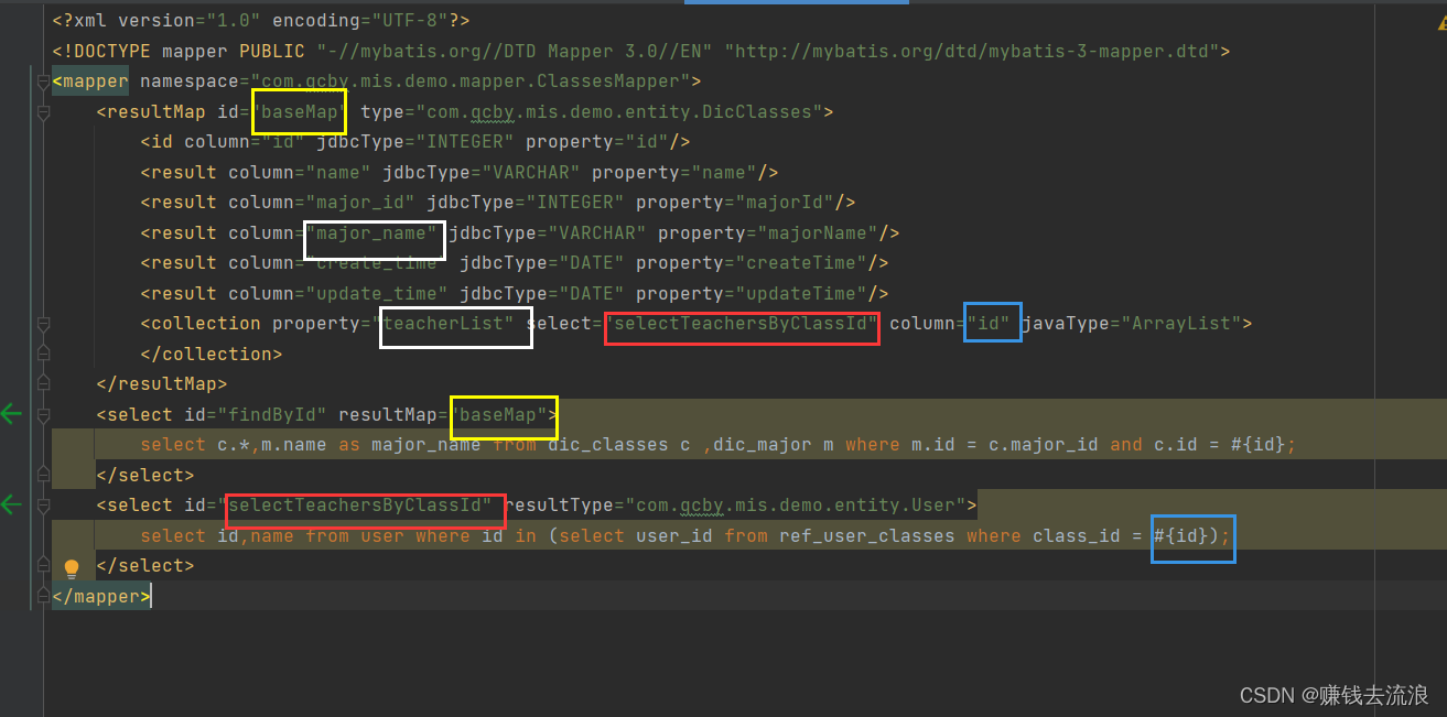 <resultMap id="baseMap" type="com.qcby.mis.demo.entity.DicClasses">