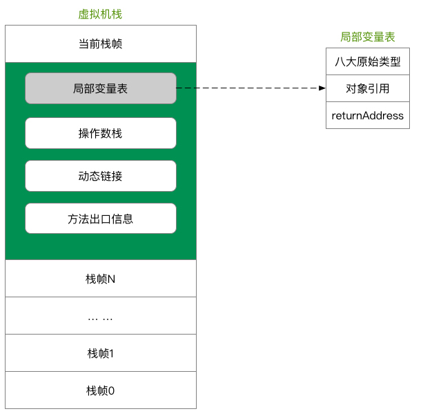 Java 虚拟机栈会为每一个即将运行的 Java 方法创建一块叫做“栈帧”的区域,用于存放该方法运行过程中的一些信息,如: