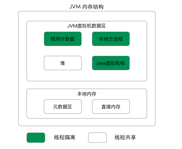 - 线程共享,整个 Java 虚拟机只有一个堆,所有的线程都访问同一个堆。而程序计数器、Java 虚拟机栈、本地方法栈都是一个线程对应一个。