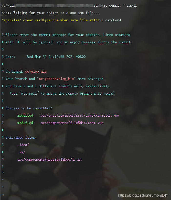 注意,index.vue 文件是你已经提交过的文件,但是要想合并到上一次 commit 中也需要 git add 添加一次。因为git add 添加的是具体的文件改动内容,而不是文件名。