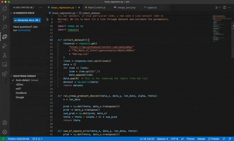 AI Doc Writer: https://marketplace.visualstudio.com/items?itemname=mintlify.document
