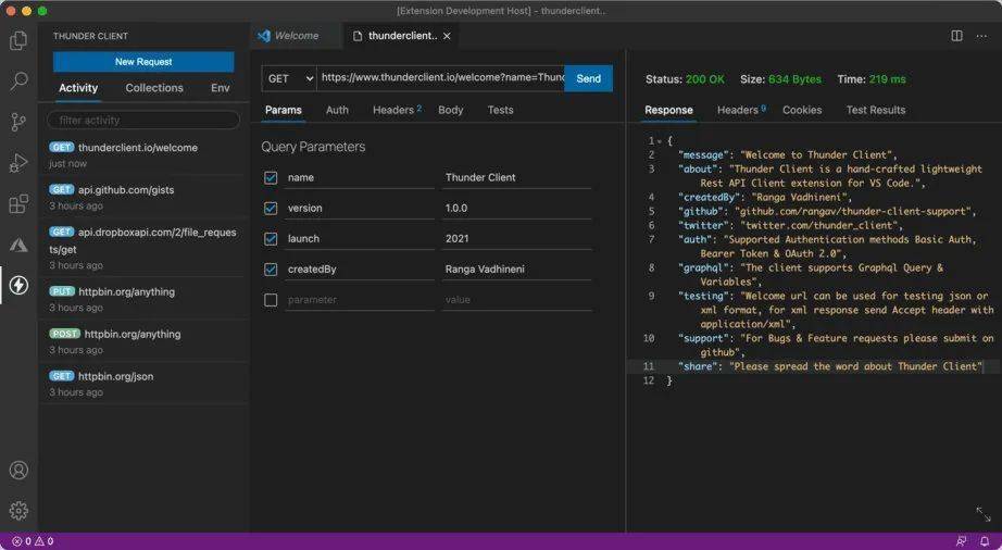 虽然叫 Thunder,但和迅雷没有关系,它的名字是雷霆客户端,是 Visual Studio Code 的轻量级 Rest API 客户端,由 Ranga Vadhineni 手工制作,设计简单干净。