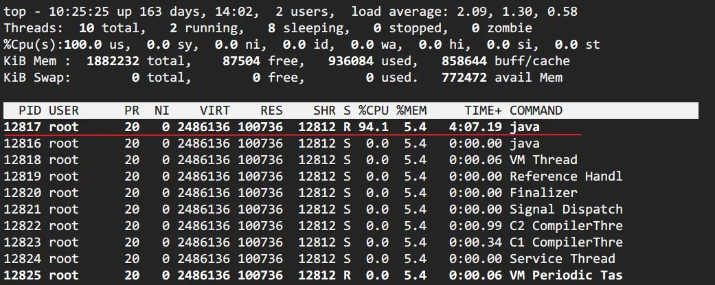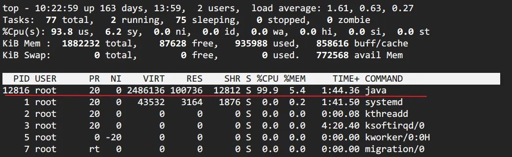 - top 定位CPU 最高的进程执行 top 命令,查看所有进程占系统CPU的排序,定位是哪个进程搞的鬼。在本例中就是咱们的java进程。PID那一列就是进程号。(对指示符含义不清楚的见【附录】)