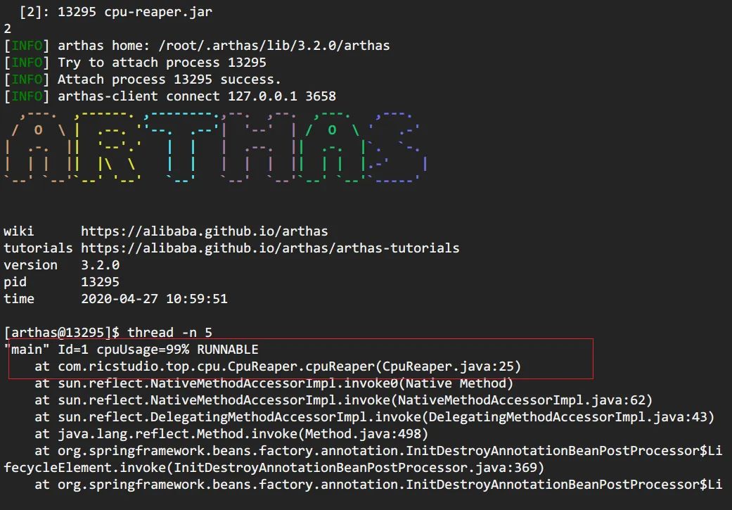 阿里开源的arthas现在已经几乎包揽了我们线上排查问题的工作,提供了一个很完整的工具集。在这个场景中,也只需要一个 thread -n 命令即可。