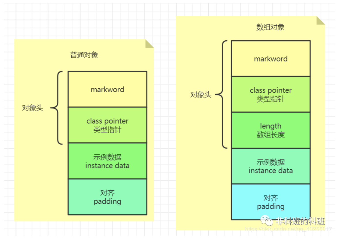 普通对象的对象头包括两部分:Mark Word和 Class Pointer (Klass Word)(类型指针),如果是数组对象还包括一个额外的Array length数组长度部分。