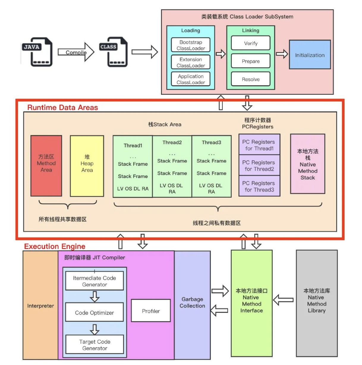 JVM是基于栈的解释型机器。这意味着JVM和物理硬件CPU不同,它没有寄存器,而是使用一个包含部分结果的执行栈,并通过操作该栈顶的一个值或多个值来执行计算。