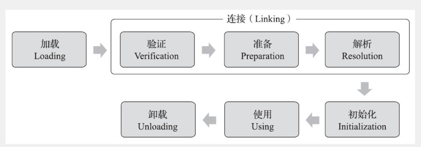 一个类型从被加载到虚拟机内存中开始,到卸载出内存为止,它的整个生命周期将会经历加载(Loading)、验证(Verification)、准备(Preparation)、解析(Resolution)、初始化(Initialization)、使用(Using)和卸载(Unloading)七个阶段,其中验证、准备、解析三个部分统称为连接(Linking)。这七个阶段的发生顺序如图7-1所示。