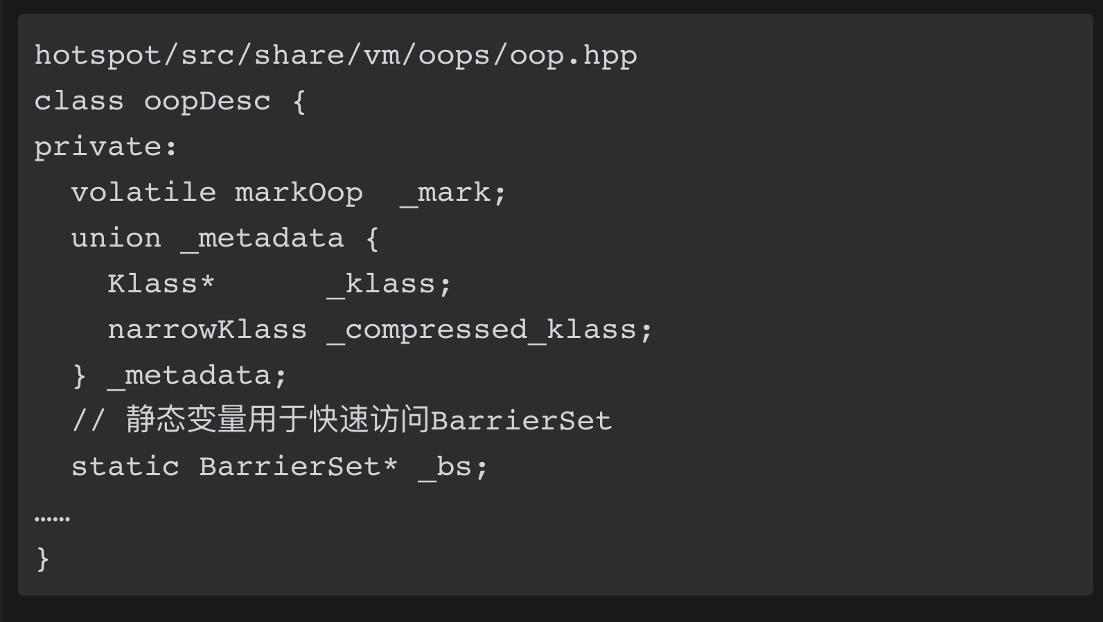 JVM中对象头分为两部分:标记信息、元数据信息,代码如下所示: