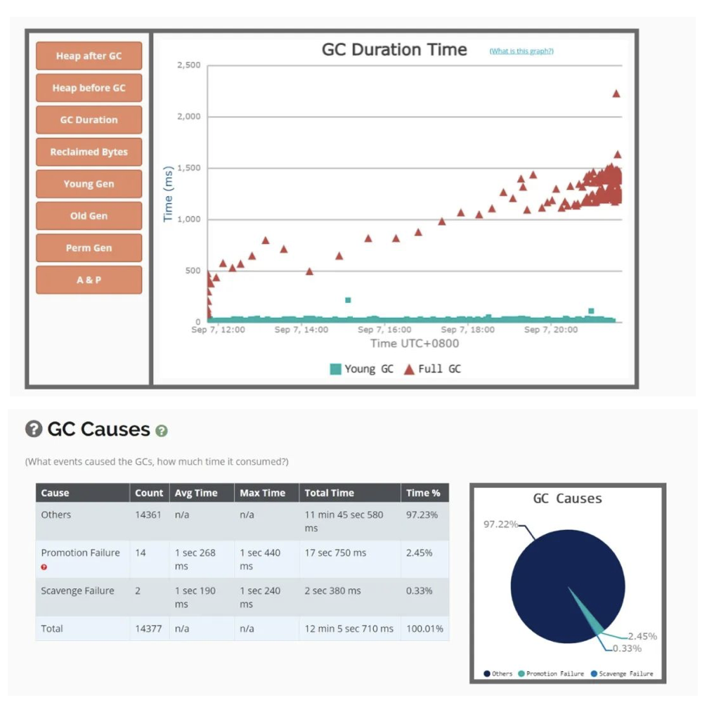 获取到gc日志之后,可以上传到GC easy帮助分析,得到可视化的图表分析结果。