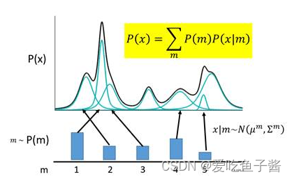 这里m表示每一条高斯分布的曲线,每采样一个m,则会获得对应的高斯分布,对于这条曲线的分布函数P(x)而言,它可以表示为以下公式: