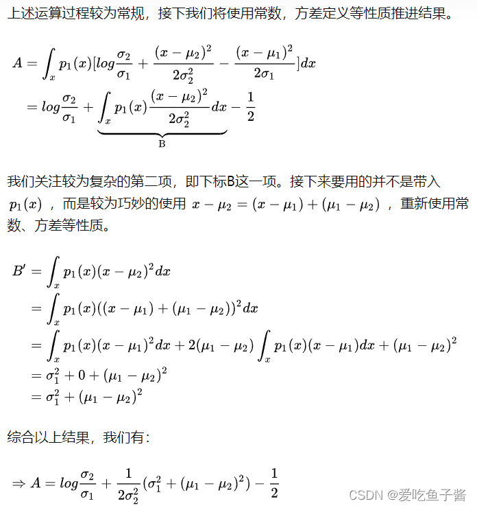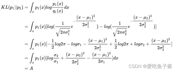,前者表示VAE模拟出的数据分布情况,后者表示数据真实的分布,接下来,根据两者之间的差异性,可以导出一个KL散度公式。
