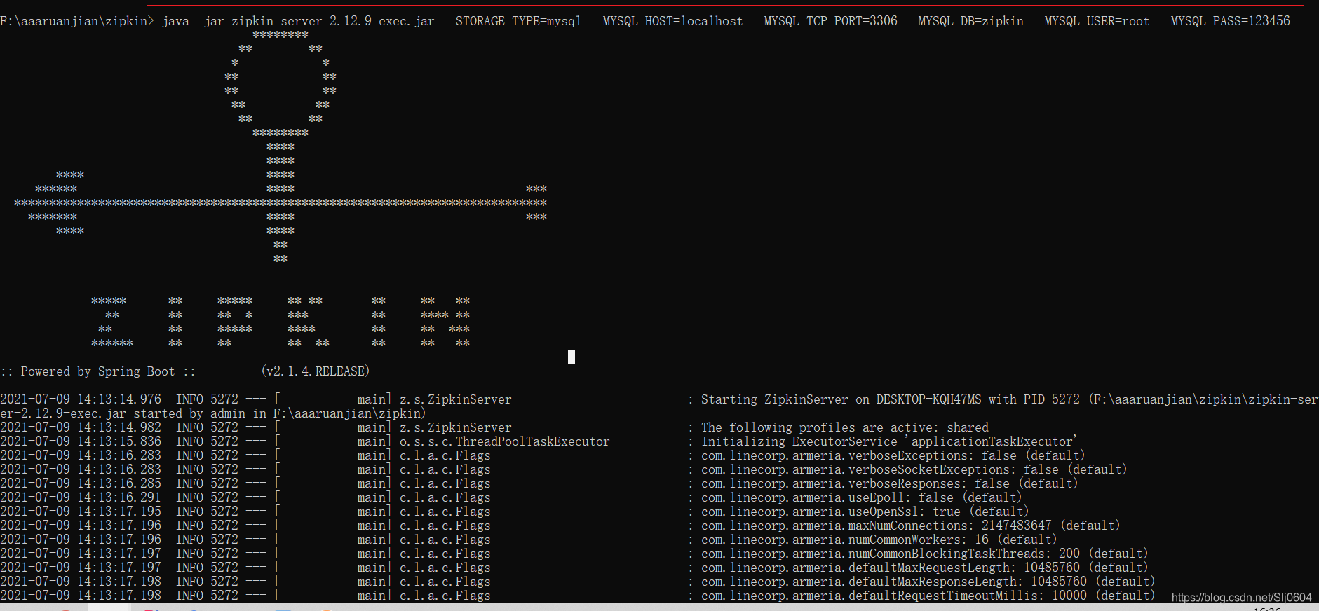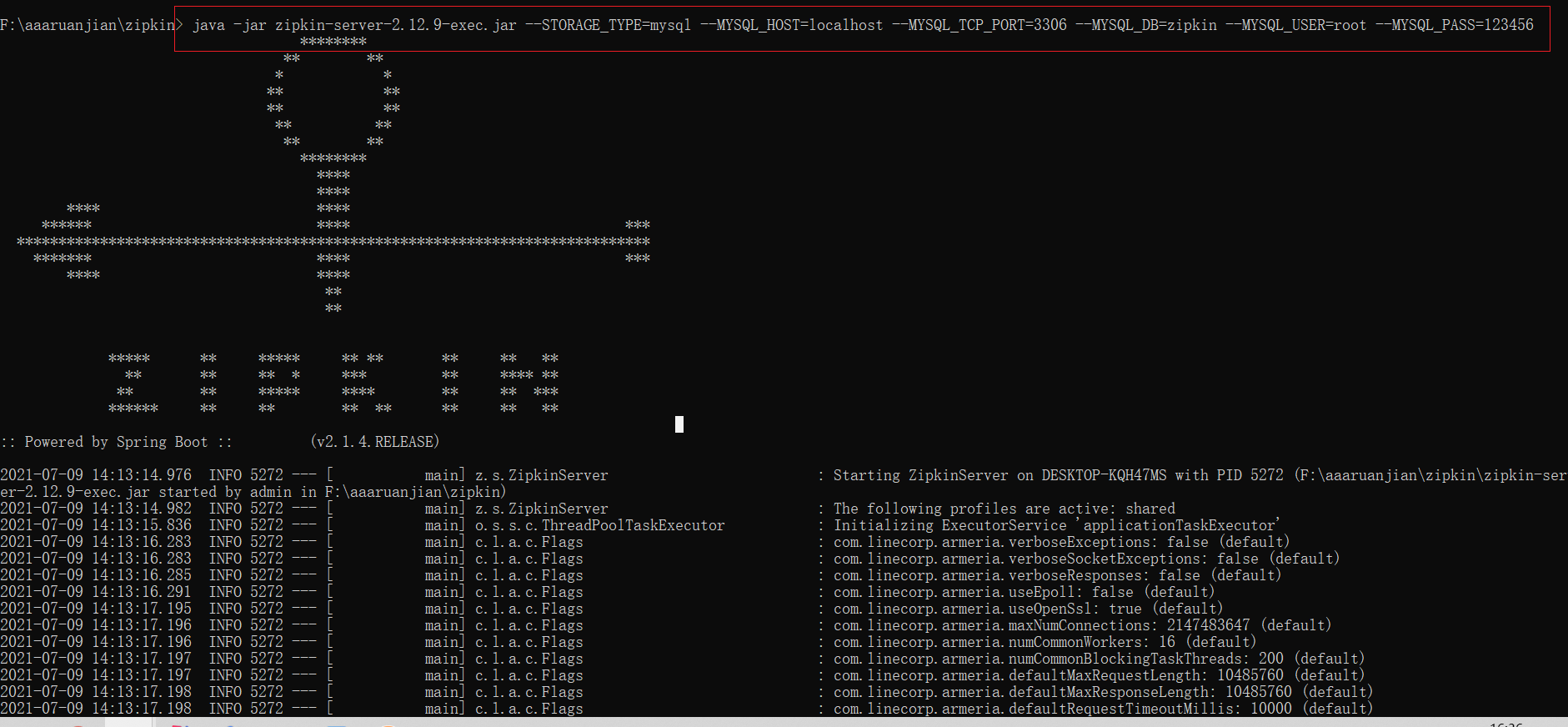java -jar zipkin-server-2.12.9-exec.jar --STORAGE_TYPE=mysql --MYSQL_HOST=localhost --MYSQL_TCP_PORT=3306 --MYSQL_DB=zipkin --MYSQL_USER=root --MYSQL_PASS=123456
