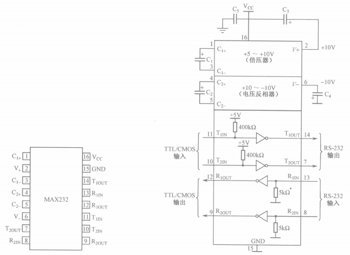 MAX232芯片是MAXIM公司生产的、包含两路接收器和驱动器的IC芯片,它的内部有一个电源电压变换器,可以把输入的+5V电源电压变换成为RS-232输出电平所需的+10V电压。所以,采用此芯片接口的串行通信系统只需单一的+5V电源就可以了。对千没有+12V电源的场合,其适应性更强,加之其价格适中,硬件接口简单,所以被广泛采用。