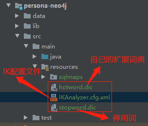 6.添加IKAnalyzer.cfg.xml 配置文件到 resources 目录下。cfg.xml 文件配置自己的扩展词典和停用词,内容如下: