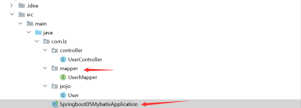 注意:可以在dao层加@mapper注解,如果不想在dao层该接口上加@Mapper注解,也可以直接在启动类上加@MapperScan注解,并在该注解后面注明扫描包的路径,在建立项目结构式一定要注意dao层一定要和启动类是同一目录结构,否则在启动上加该注解会扫描不到