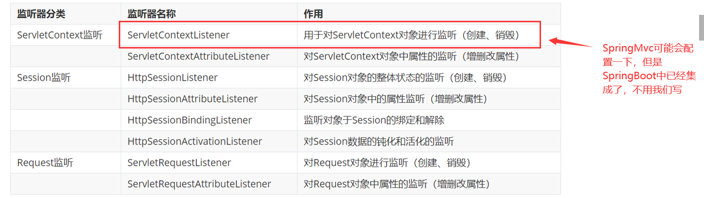 这里面只有 ServletContextListener 这个监听器后期我们会接触到,ServletContextListener 是用来监听 ServletContext 对象的创建和销毁。