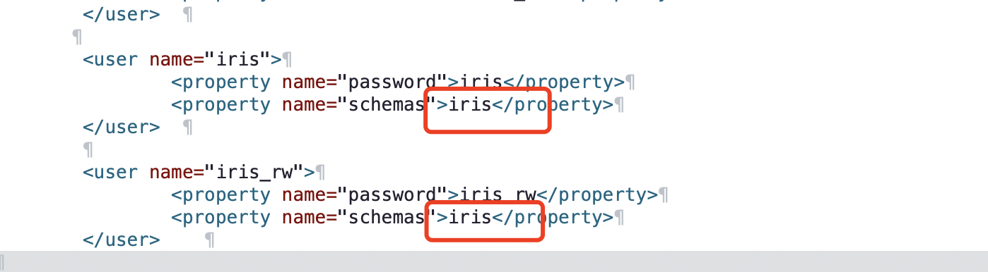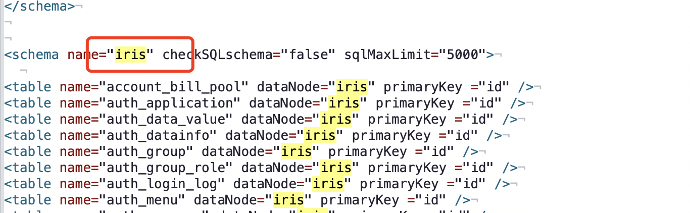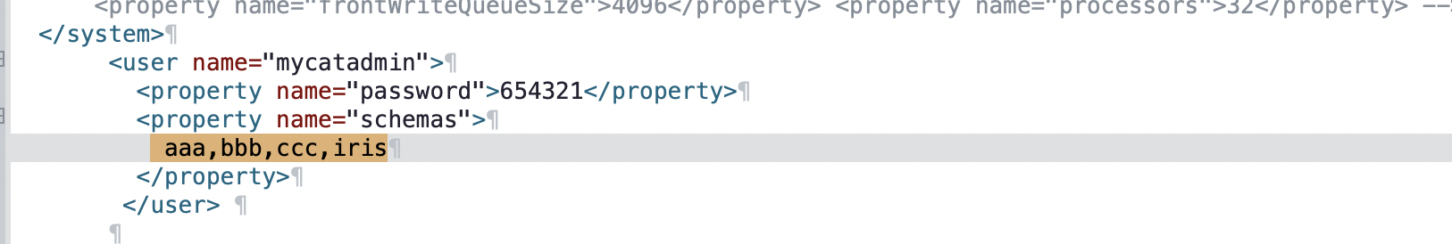 逻辑库aaa,bbb,ccc是原来mycat中已存在的库,iris为新增,直接添加在其后即可。
