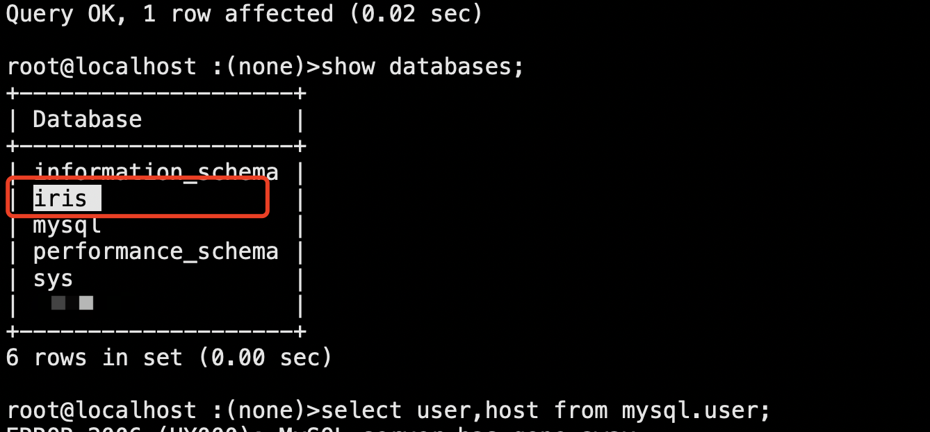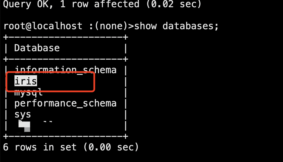 database=“iris",指的就是”create database iris“这里的db,保持一致即可,有的情况是分库表、有多个节点,每个节点上的db可能名字分别是iris_db1、iris_db2……iris_dbn,那么这里就分别是database=iris_db1、iris_db2。
