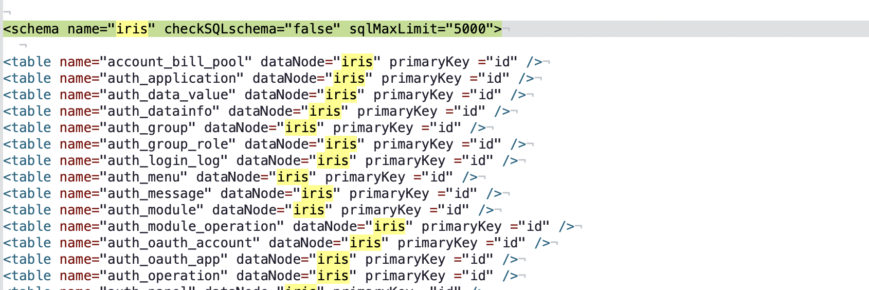 <schema name="iris" checkSQLschema="false" sqlMaxLimit="5000">