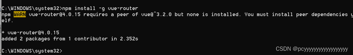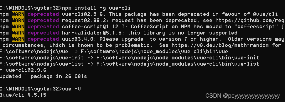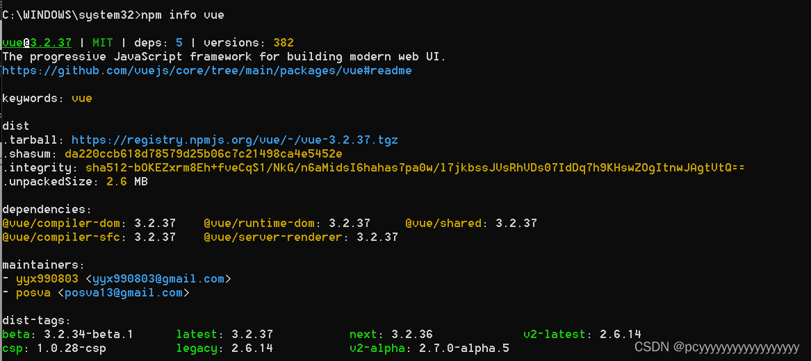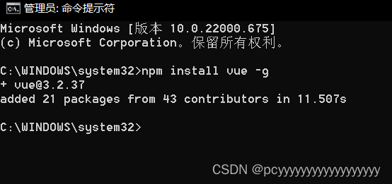 cnpm install vue -g安装完可以查看到自己安装的版本信息,我现在是安装的3.2.27版本的。