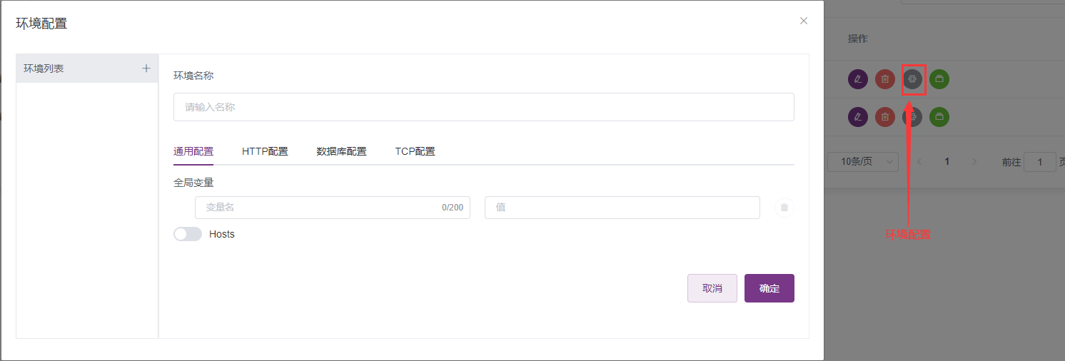 新增环境配置,通用配置中为全局变量,HTTP配置可配置请求链接以及全局请求头参数