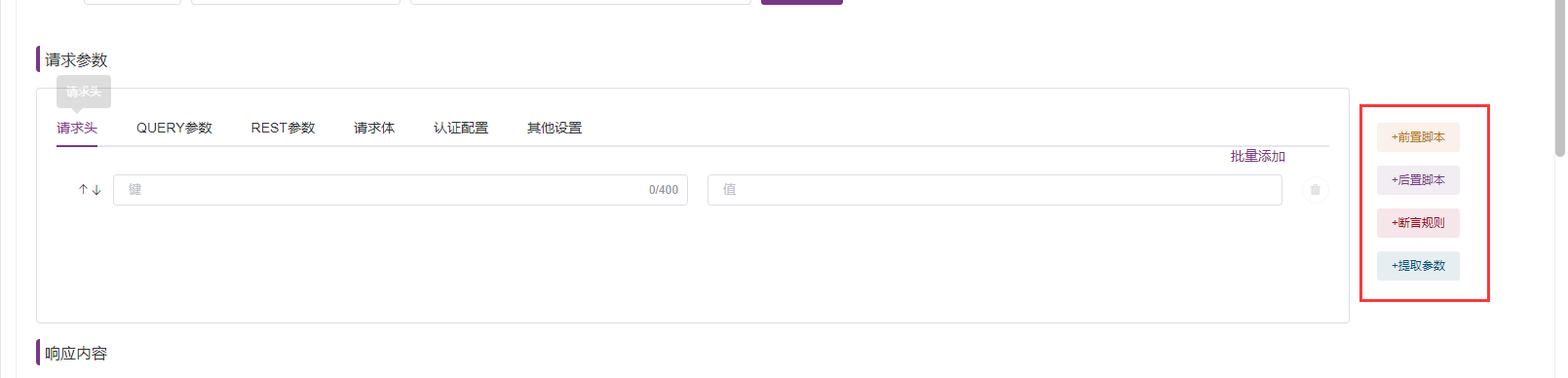 测试页面有前置脚本、后置脚本、断言规则、提取参数4个功能可以处理请求、响应参数