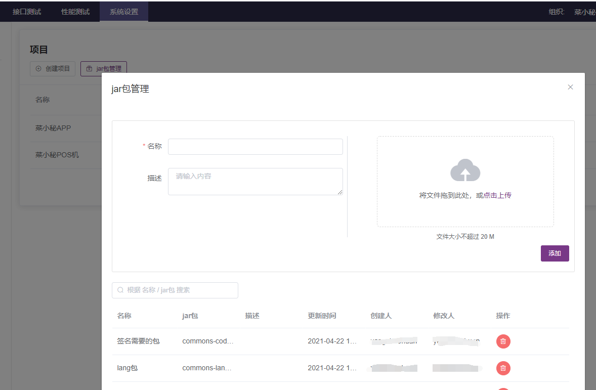 如使用beanshell脚本时使用了第三方jar包则需要在系统设置-项目管理中 JAR包管理中上传对应的jar包即可