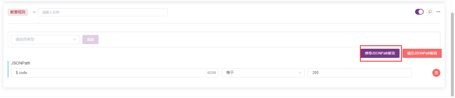 在接口测试通过后,点击断言规则,点击推荐JSONPath断言,可在弹出的对话框中点击红色框可生成对应的断言规则