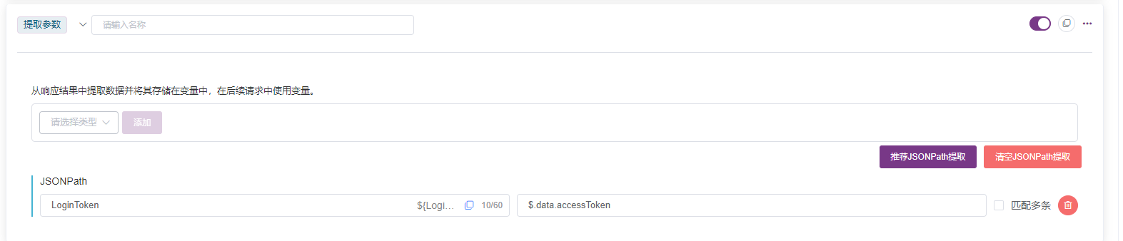 在接口测试通过后,点击提取参数,点击推荐JSONPath断言,可在弹出的对话框中点击红色框可生成对应的提取规则