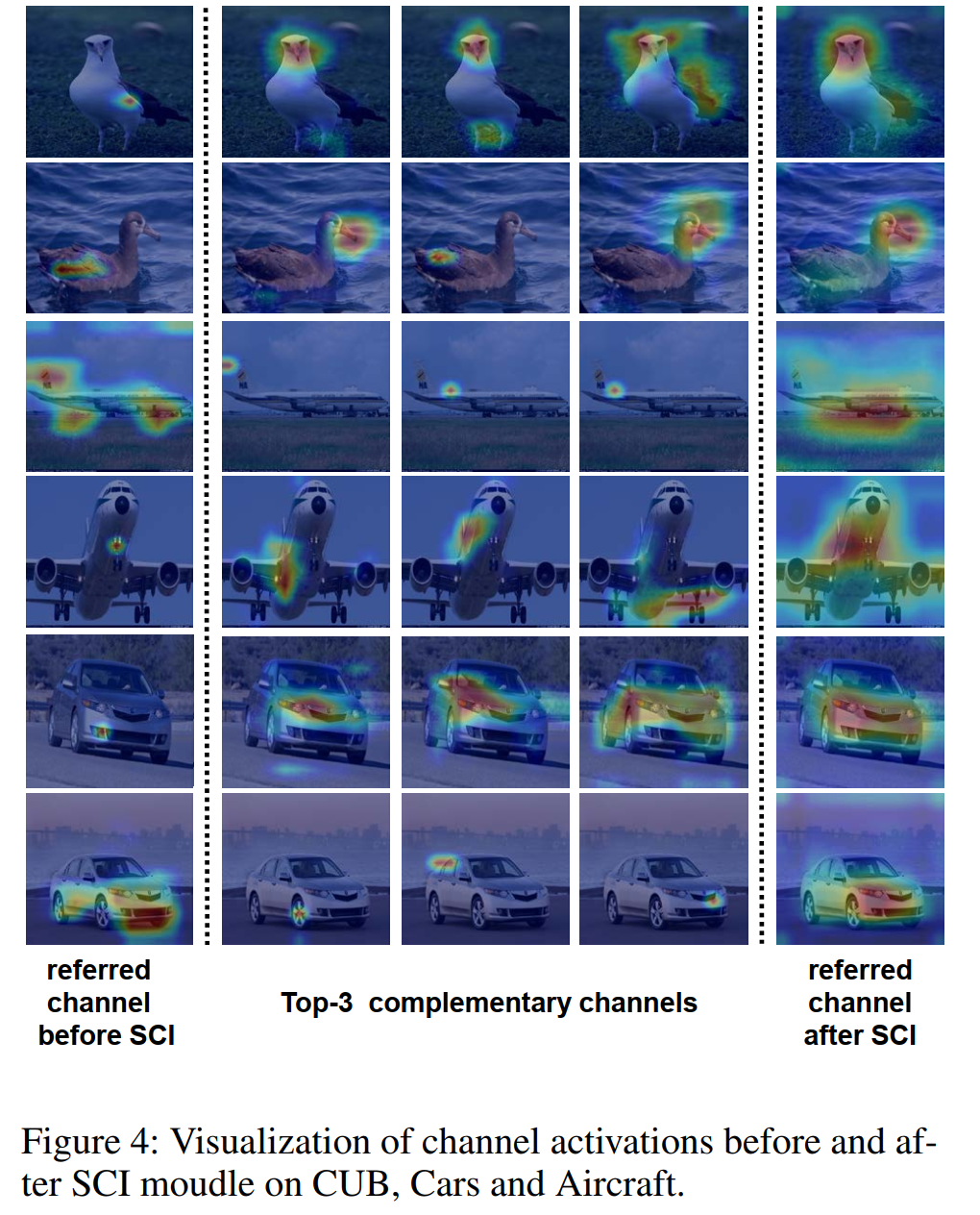 第2列到第4列是它的三个最互补的通道。换句话说,为了更好地理解CIN模拟的图像内和图像间通道相互作用,我们在SCI和CCI模块中可视化了通道相关性和神经激活。图4显示了SCI模块对来自三个不同数据集的图像的可视化。第1列显示SCI之前随机选择的通道(假设为第i个通道)的激活情况。第2列到第4列是它的三个最互补的通道。换句话说,这三个通道对应于方程式7中定义的SCI矩阵W第i行中具有最大值的通道。最后一列代表Yi,它是SCI之后的第i个频道。我们发现,对于一个参考通道,前三个互补通道往往捕获不同的语义。例如,在图4的第一个示例中,参考通道在翅膀周围有强烈的激活,其互补通道更多地集中在头部和尾部区域。因此,注意特征通道通过这种互补信息得到增强,并在其他辨别部位激活。请注意,在我们的SCI模块之后,激活跨越了大多数对象部分,这表明SCI有效地模拟了不同通道之间的交互,并将其互补但有区别的部分结合起来,以产生更多信息的特征。