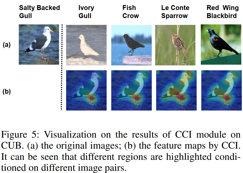 图5:在CUB数据集上的CCI模块可视化结果。(a)是原始图像;(b)是CCI得到的特征图。可以看出在不同图像对条件下突出的区域也不同。