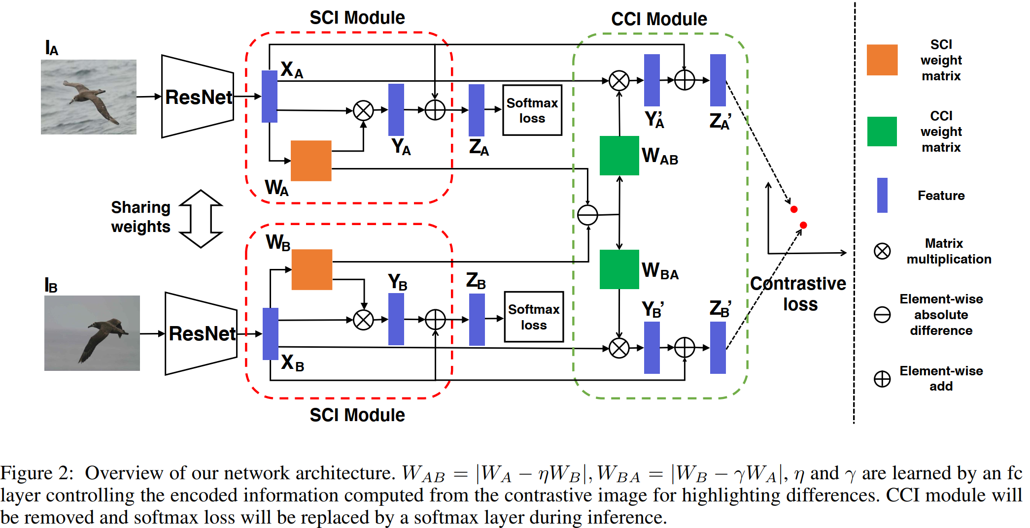 是学习得到的,从受对比图像中计算得到的编码信息控制的全连接层(fc)中学习得到。CCI模块在推导过程中会被移除,softmax loss也会被一个softmax层取代。