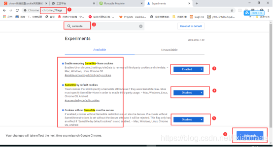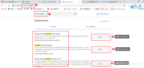 2.1 经查阅资料, chrome浏览器有跨域拦截,即sameSite。不同域下无法携带cookie。解决方法为在谷歌浏览器地址栏中输入chrome://flags/,将关于sameSite的属性设置为disabled,重启浏览器即可。这是针对80版本以上的chrome浏览器。