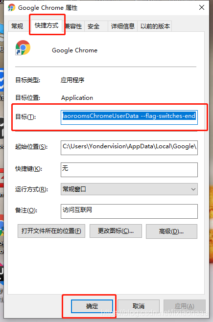 注意目标中的原路径和新加入的启动参数之间要加一个空格。否则会报错。并在此操作前先备份自己的浏览器书签和常用密码。