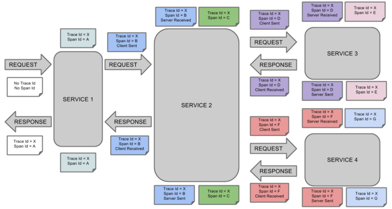 将 Span 和 Trace 在一个系统中使用 Zipkin 注解的过程图形化: