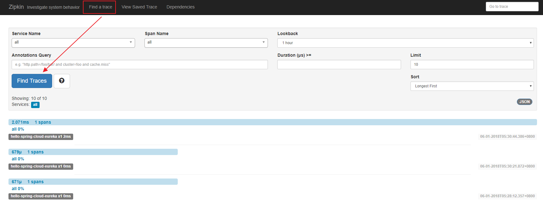 点击 Find a trace,可以看到具体服务相互调用的数据