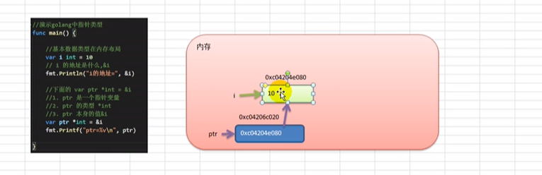 - 指针类型,指针变量存的是地址,var ptr *int = &num