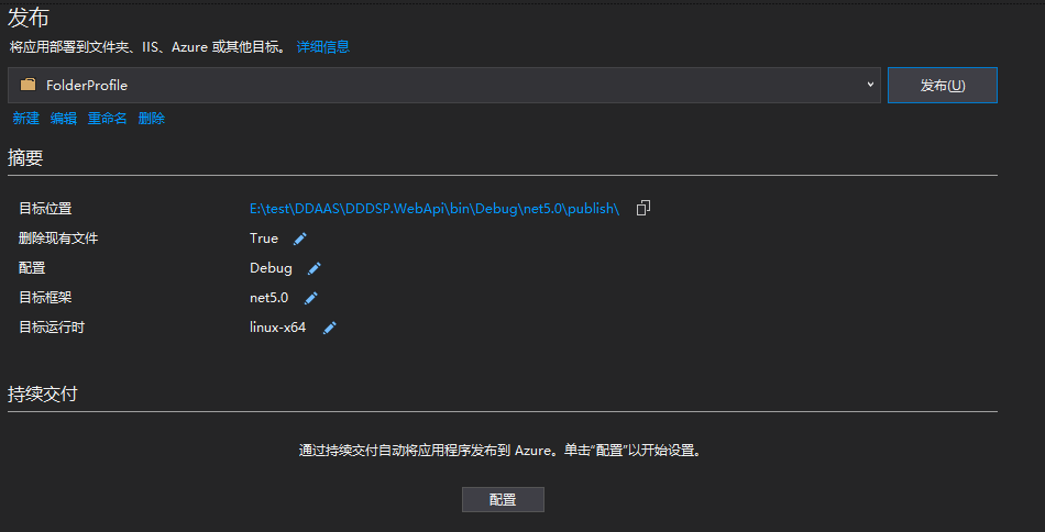 - 3.1 这时候程序有了,点选项目文件,右键点发布,选择“将应用部署到文件夹.....”,点“完成”(实际并没有完成,不要怕,先点。),会出现配置界面,如下图。