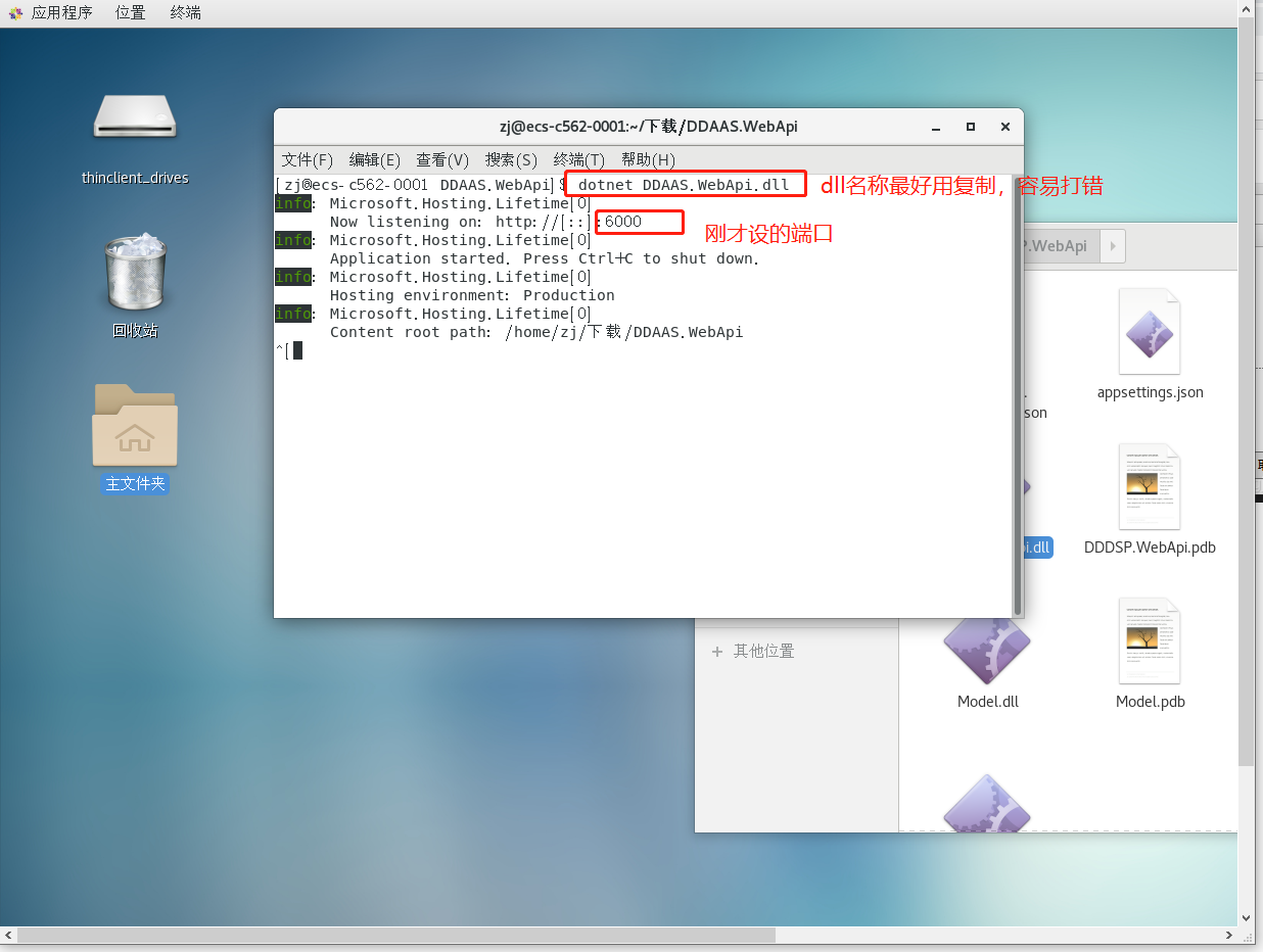 - 5.2 在所在文件夹,右键打开命令行窗口,输入dotnet xxxx.dll,则会成功跑起,结果如下图