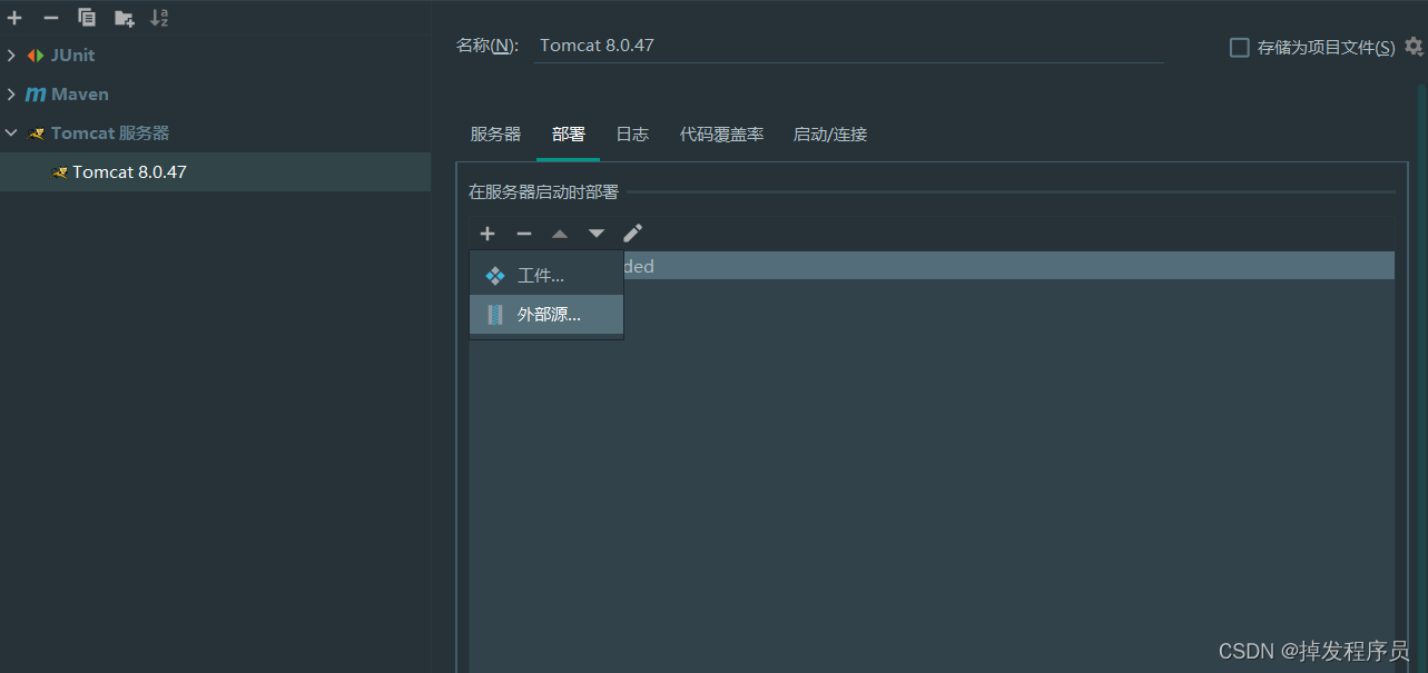 @RequestMapping("/upload") public String upload(HttpServletRequest request, MultipartFile xxx){ try { FileUtils.copyInputStreamToFile(xxx.getInputStream(),new File("E:/aaa/"+xxx.getOriginalFilename())); } catch (IOException e) { e.printStackTrace(); } return "bookList"; }第五步:添加Tomcat部署外部源