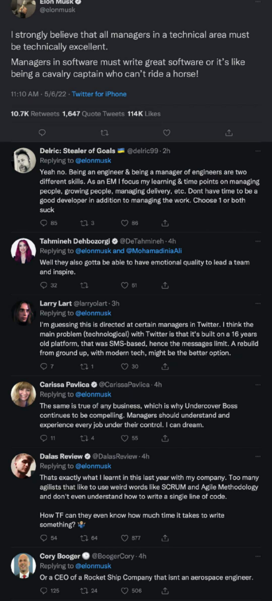 马斯克在今年也曾发布一条 Twitter,表示深信技术领域的管理者必须具备优秀的技术能力,领导软件开发的人也需擅长写代码。这个说法深受一线开发人员赞同,但马斯克照样也收到了一些管理者的强烈反对,评论中有人认为管理能力和技术能力不是一回事儿,一个人是不可能同时掌握好这两种能力的......