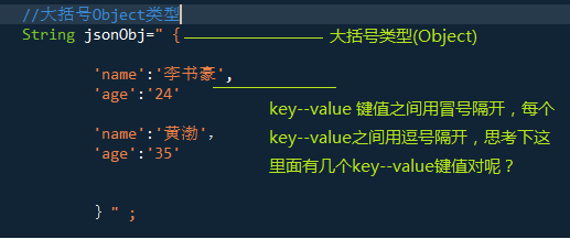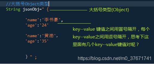 1.对象结构------以大括号开始,以大括号结束,中间部分包含键值对,键和值之间以冒号分隔,其中键是字符串,值可以是字符串,数值,true/false,null,对象或数组,不同键值对之间以逗号分隔开。